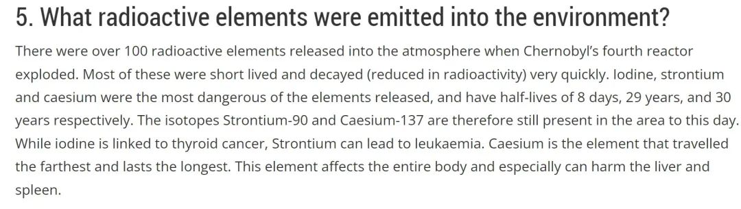 根据国际原子能机构(IAEA)的报告,切尔诺贝利的4号反应堆爆炸后,有100多种放射性元素被释放到大气中,其中大多数寿命很短,并且很快就会衰变(放射性降低),而碘、锶和铯是其中最危险的元素,它们的半衰期分别为8天、29年和30年。放射性碘会引发癌症,锶可能导致白血病,铯则可能会影响整个身体,尤其是肝脏和脾脏。