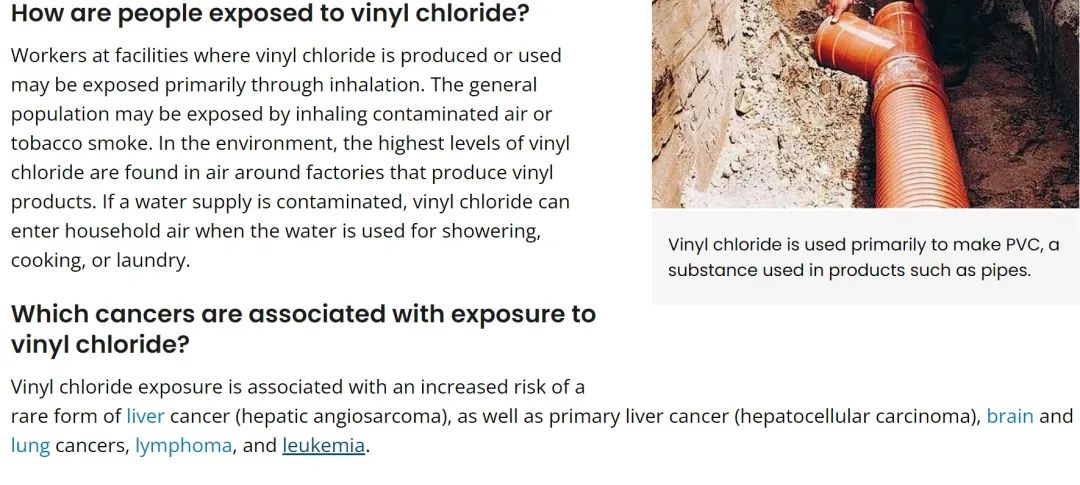 在室温下,氯乙烯是一种人造的易燃、无色气体,主要用于制造PVC塑料。根据俄亥俄州健康评估(SHA)报告以及美国国家癌症研究所(NIH)的描述,氯乙烯主要通过直接吸入的方式进入人体,饮用被污染的水源以及通过皮肤或眼睛不慎接触,也有可能摄入少量氯乙烯。而呼吸或饮用氯乙烯后究竟会对健康产生多大影响则取决于人体接触氯乙烯的剂量、时长、频率以及接触者的一般健康状况、年龄和生活方式。常年吸入高浓度的氯乙烯可能对肝脏、神经系统以及免疫系统都造成损伤,且会增加罹患罕见肝癌(肝血管肉瘤)、原发性肝癌(肝细胞癌)、脑癌、肺癌等癌症的风险。此外,氯乙烯不完全燃烧得到的化学产物,有可能包括一氧化碳、剧毒的二噁英和光气等物质。