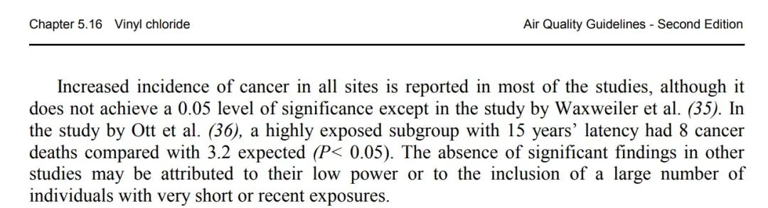 世界卫生组织欧洲办事处一份报告综合了12个氯乙烯引发工人癌症的研究,研究对象大多长久暴露于氯乙烯浓度较高的环境中。WHO指出,在研究周期较长(超过15年)的实验中,数据能有效表明氯乙烯引起的患癌风险增加。而大部分实验在有限的随访时间中进行的研究可能无法准确记录患不同癌症(尤其是肺癌和血管肉瘤)的人数。但共有8项研究报告了肝血管肉瘤,这个结论是相对一致的。总体来说, 处于1μg/m³浓度中的终生风险估计为10^(-6),即1×10^(-6)μg/m³(这意味着在一百万人口中可能有一个因暴露在氯乙烯环境中出现的癌症病例)。