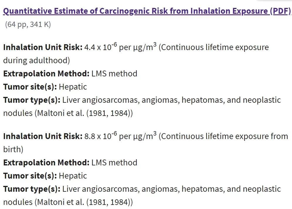 美国环保署的氯乙烯致癌单位风险评估截图