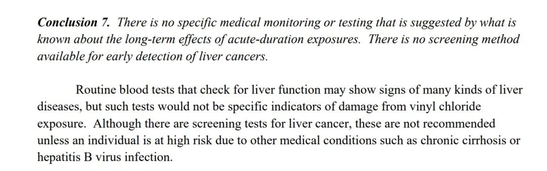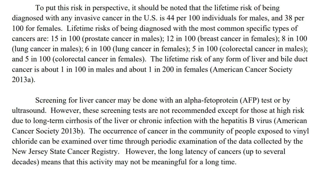 此外,报告中还表示,并没有可用于早期肝癌的筛查,对肝功能的检查也不能作为因摄入氯乙烯造成损害的指标,通过定期检查新泽西州癌症登记处收集的数据,可以随着时间的推移排查暴露于氯乙烯的人群中癌症的发生情况,然而,癌症的潜伏期很长(长达几十年),这意味着这种排查可能在很长一段时间内都没有意义。