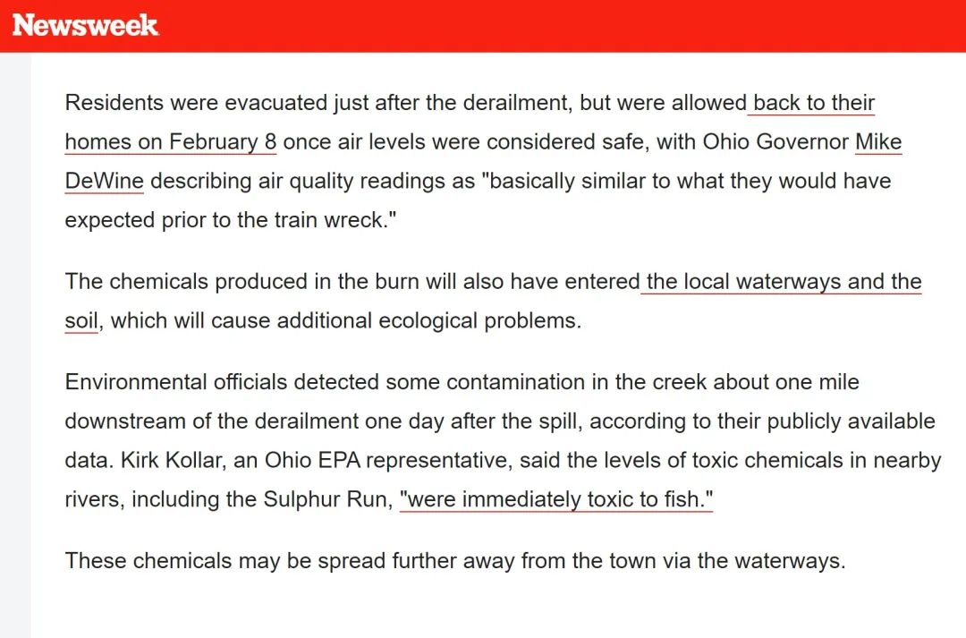 《新闻周刊》等多家媒体报道泄漏对附近的河流产生了污染