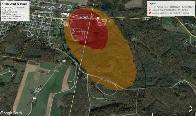 另一方面,根据《纽约时报》报道,俄亥俄州事故发生地位于匹兹堡西北约50英里(约80公里)处,当地小镇约有4700名居民。俄亥俄州政府在组织疏散时囊括了周围1英里×2英里的区域(约为3.2平方公里)内的约1500人。且目前疏散早已结束,居民仍在正常生活。《新闻周刊》报道指出,虽然化学品泄漏的整体生态影响尚不清楚,但污染可能会通过城镇周围的空气持续传播数英里,具体取决于释放的化学品的浓度和当地条件。“这在很大程度上取决于天气条件,特别是风速和风向以及数量——但可能远超半径为100英里的区域(约8万平方公里)。”河流污染学专家Veronica Edmonds-Brown认为。