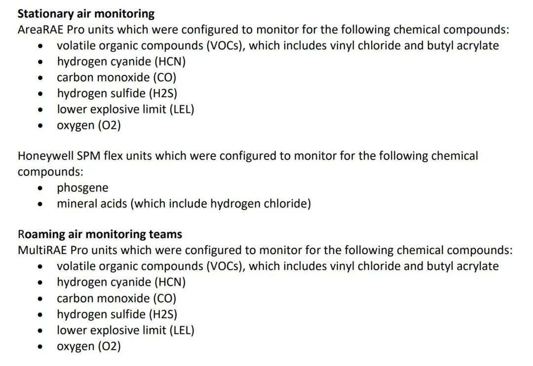 EPA公开的空气监测指标中包括了:挥发性有机化合物(包括氯乙烯和丙烯酸丁酯)、光气、无机酸(包括氯化氢)、氰化氢、一氧化碳、硫化氢,但没有显示对二噁英进行监测