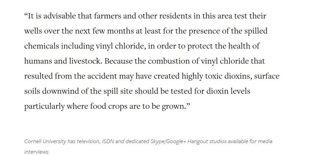 从事故发生后的环境监测结果来看,美国环保署(EPA)每日更新的报告都表示未发现有任何气体质量超标,水质也并无问题,目前完成了对525户家庭的室内空气筛查。不过,氯乙烯燃烧除了会产生酸性有毒气体氯化氢,也有概率会产生光气(曾被用作化学武器)和剧毒的有机化合物二噁英等有毒气体,而根据EPA提供的空气监测常见问题报告,其目前正在监测中的化学物质并不包括二噁英。这一点也有部分专家提出质疑。康奈尔大学的土壤和作物专家Murray McBride表示,“应对氯乙烯泄漏地点下风处的表层土壤进行二噁英含量测试,尤其是在种植粮食作物的地方。”