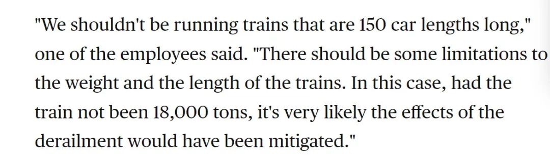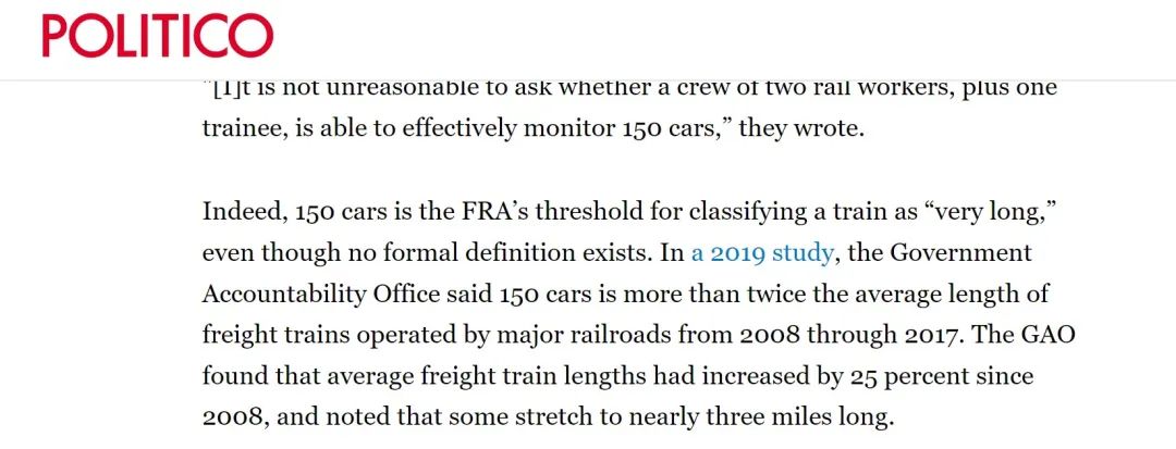 Politico的报道称,在2019年的一项研究中,政府问责办公室曾表示,150节车厢是2008年至2017年主要铁路运营的货运列车平均长度的两倍多。且自2008年以来,货运列车的平均长度增加了25%,有些延伸到将近3英里(约4.8公里)。