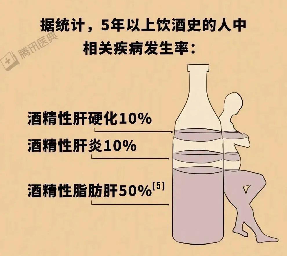 而长期过量饮酒,即男性每天饮酒>60 g(相当于2瓶半750 mL的啤酒或3两半高度白酒)、女性每天饮酒>40 g(相当于1瓶半750 mL的啤酒或2两半高度白酒),则会持续地腐蚀肝细胞[4],引起一系列的疾病。