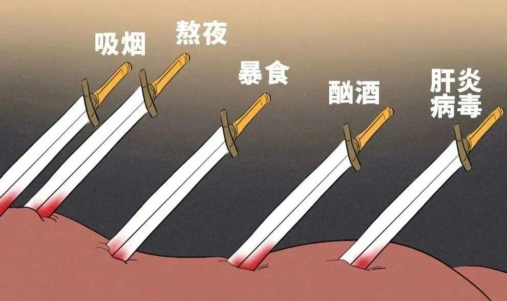 经过多年的战斗,肝细胞护卫队的战斗力会逐渐减弱。尽管他们依然隐忍,会带着伤继续默默地工作着,但你却可能并不知道它受到的委屈,继续“我行我素”的生活。每天“放纵”着各种不良生活习惯,三高美食吃不停,烟不离手,酒不离口,晚睡晚起……