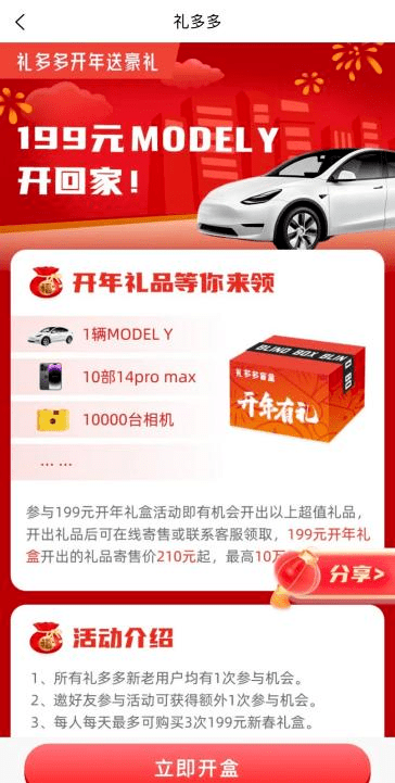 “199元特斯拉Model Y开回家”,这是一款名为礼多多盲盒App上的大奖。该盲盒奖品页显示最大奖为特斯拉Model Y一年使用权,价值10万元,中奖率为0.1%,页面信息显示已有7万多人购买了该款盲盒。