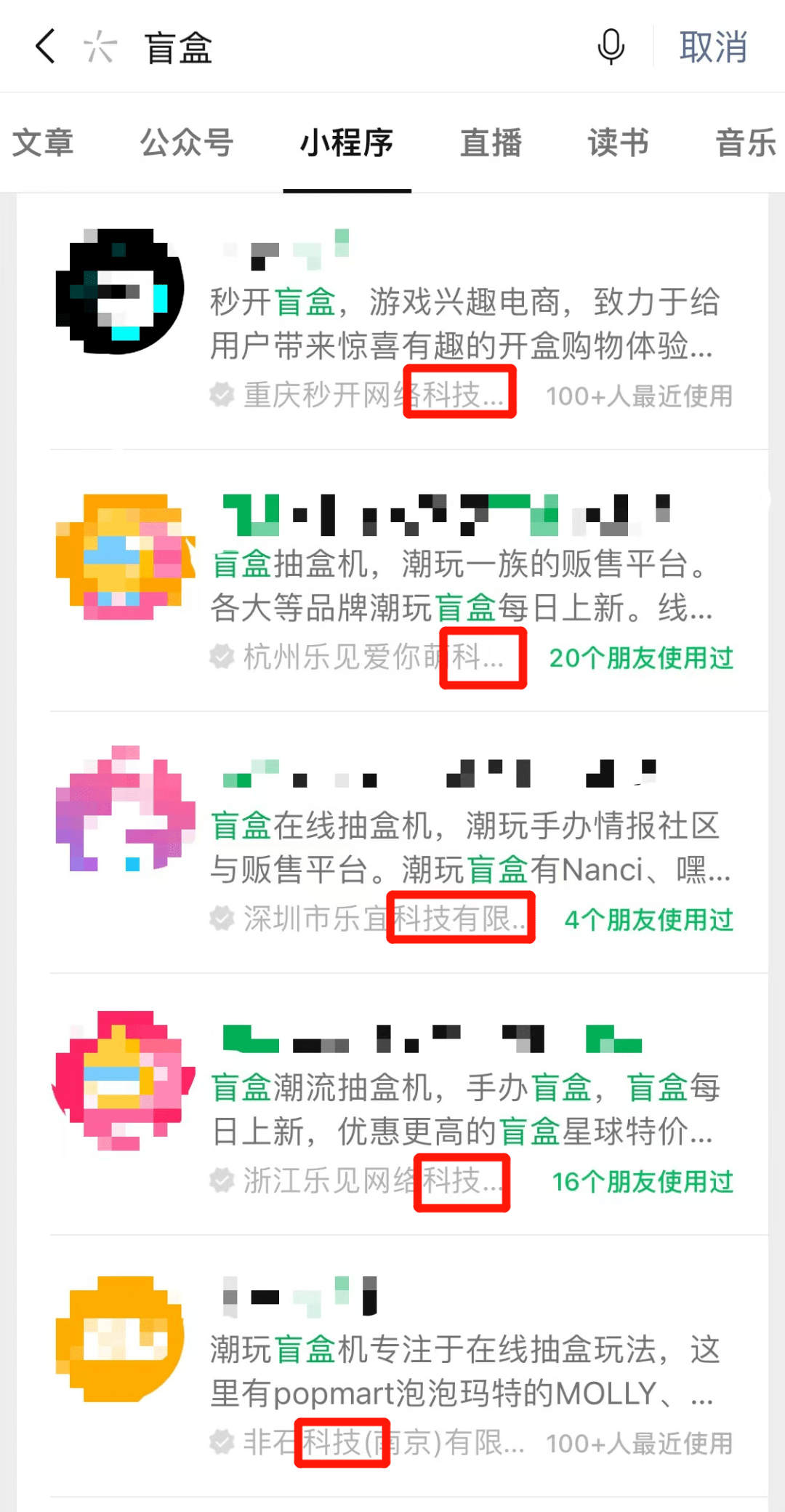 以“盲盒”为关键词在微信小程序搜索,大部分电子盲盒的主体公司均为“科技”或“文化娱乐”公司,做一款电子盲盒究竟有没有门槛?