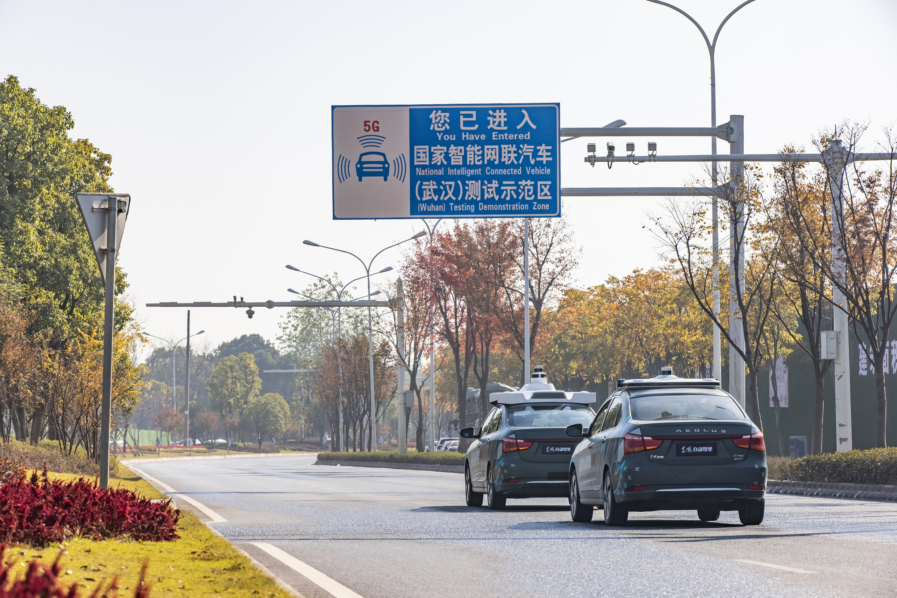 车辆在国家智能网联汽车(武汉)测试示范区行驶。本文图均来自武汉经开区工委宣传部。