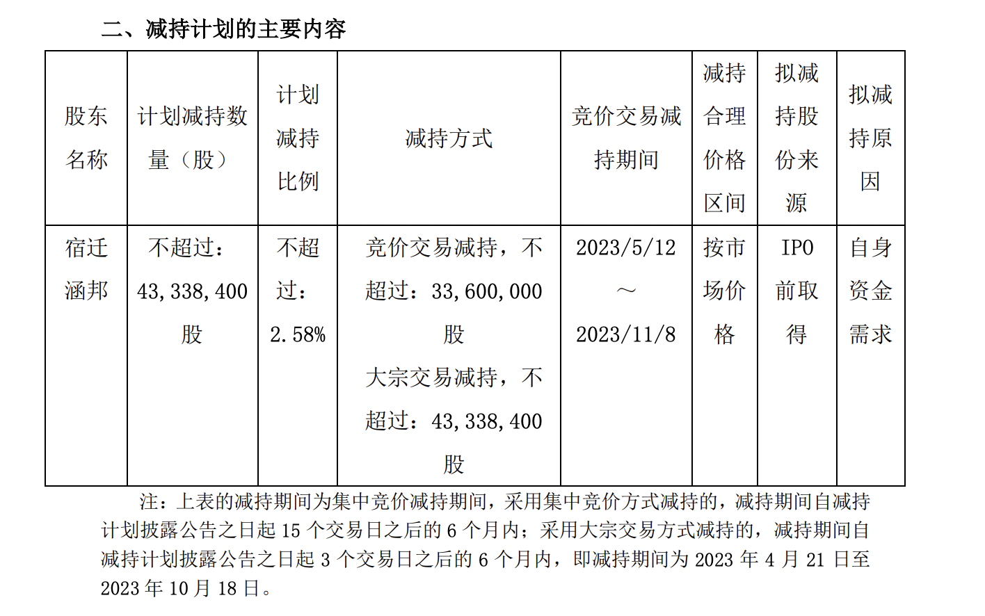 中国黄金股东宿迁涵邦计划清仓式减持。4月17日,中国黄金集团黄金珠宝股份有限公司(证券名称:中国黄金,证券代码:600916)公告,经股东宿迁涵邦投资管理有限公司(以下简称“宿迁涵邦”)内部决策,宿迁涵邦拟通过集中竞价、大宗交易的方式合计减持所持有的公司股份不超过4333.84万股、减持比例不超过公司总股本的2.58%。计划减持时间为2023年5月12日至2023年11月8日,拟减持原因为自身资金需求。
