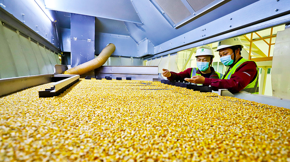 2022年10月26日,甘肃张掖,工作人员正在玉米制种精选机前查看优质玉米良种的精选生产情况。人民视觉 资料图