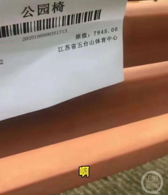 20日上午,上游新闻(报料邮箱baoliaosy@163.com)记者通过视频发现,在五台山体育中心的公园长椅和体育健身器材上,都贴着一张打印出来的标签,上面显示了该器材的所属场馆、名称、条形码、编号、原值等,最后的落款为江苏省五台山体育中心。以一个最普通的公园长椅为例,打印资料上显示的价格为7945元,拍摄者感叹:“7000多块钱,一个手机都不值7000,金子做的啊?”