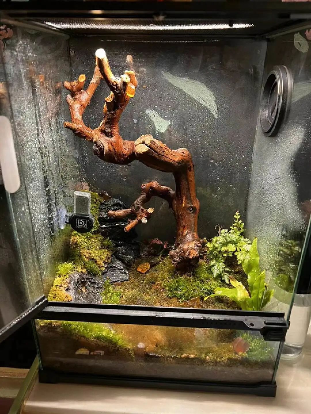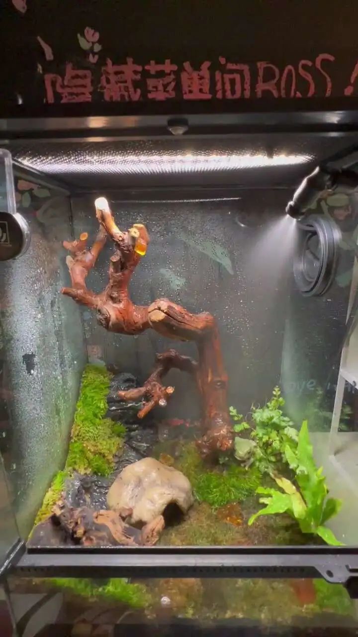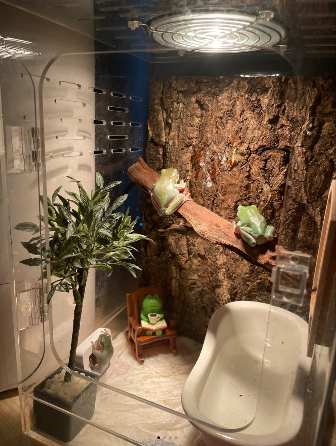 天宇现在有三只蛙,每天看到蛙们在雨林缸内进食生活,哪怕它们只是静静的呆着,都能让天宇感到惬意。