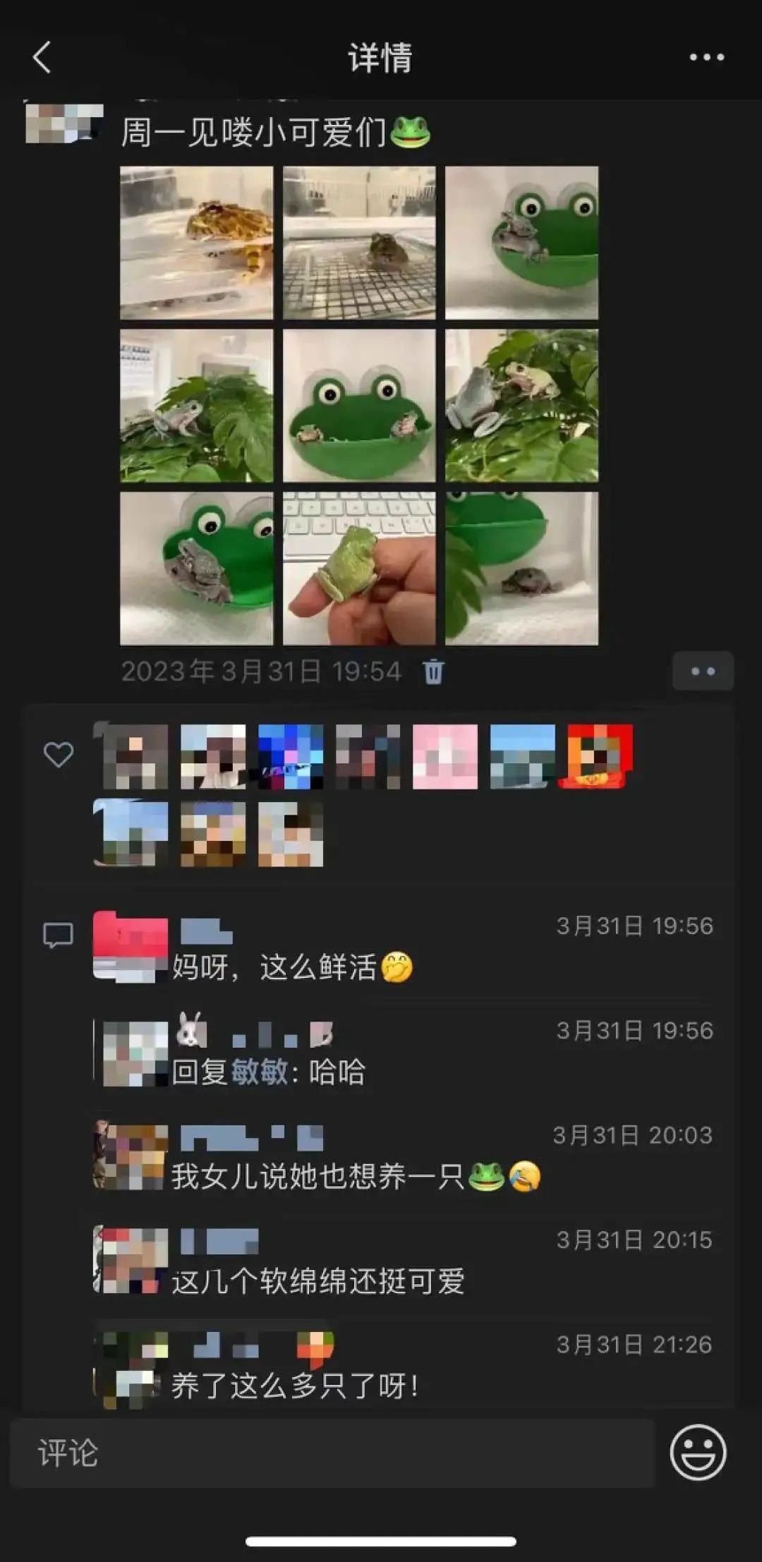 小mi后续把爱蛙分享在朋友圈,也有人不理解。有的认为只有毛茸茸的动物才称得上可爱,所以老爷蛙并不可爱。还有的质疑老爷树蛙不通人性,但更多的还是好奇与赞美。