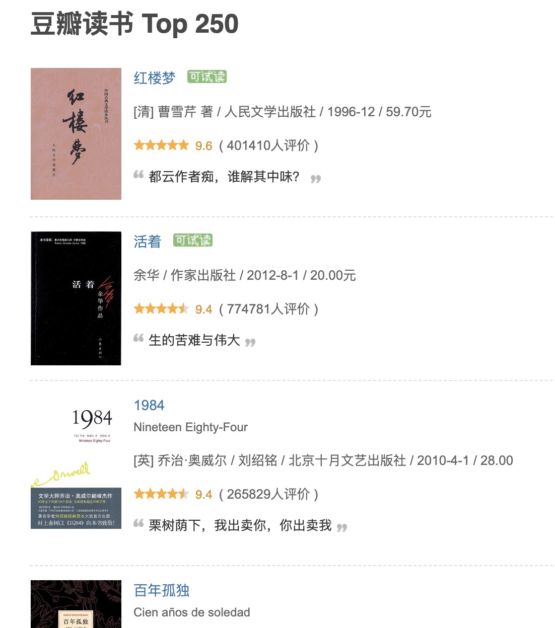 在豆瓣读书TOP榜,我们会看到排在前十的中国当代文学仅有三部:《活着》《三体》《房思琪的初恋乐园》,如果再把范围拉到前三十,还可以加上:《撒哈拉的故事》《天龙八部》《明朝那些事》《沉默的大多数》《平凡的世界》。