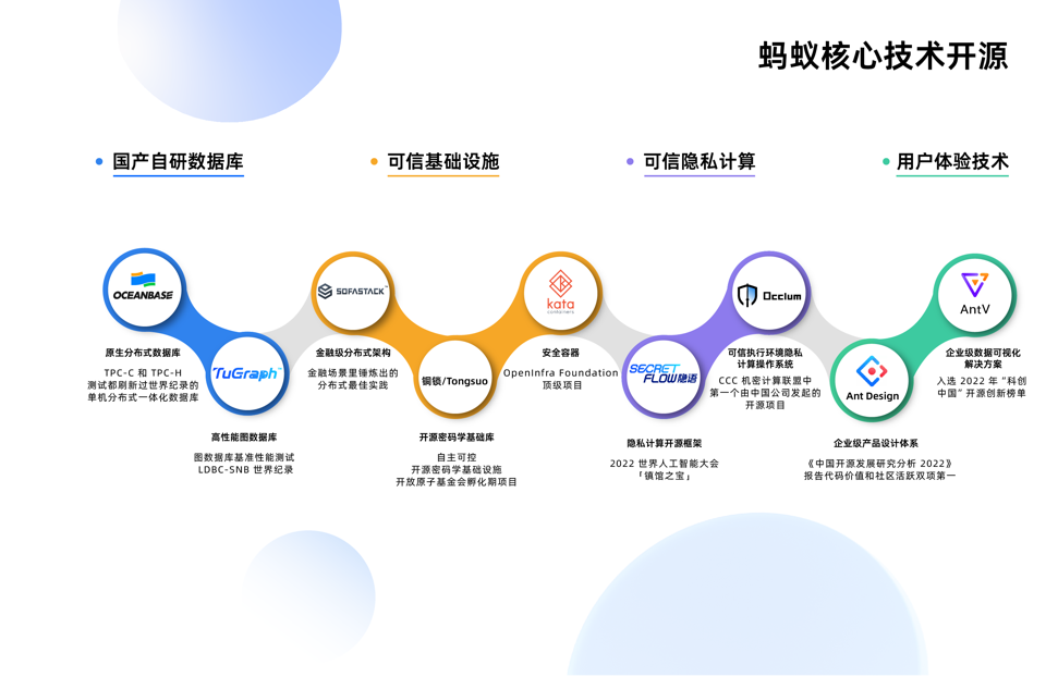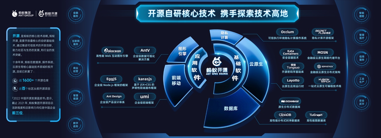 安全可信、协作共识、大规模复杂数据分析、海量存储计算、算力能耗等问题是数字化升级需要解决的关键技术问题。过去19年,依托于支付宝的业务需求,蚂蚁集团自研了以数据库、云原生、隐私计算、图计算为代表的数字化“根技术”。从研发之初,这些技术就经历了支付宝海量数据场景下的严苛考验,在复杂场景应用中锤炼出高可用、高性价比的技术优势,是支撑支付宝业务的核心技术能力,也是支撑数字化的“根技术”。本次公布的开源大图里,9大核心数字技术均已开源。其中,蚂蚁自研的国产分布式数据库OceanBase是数字技术底座里的关键卡脖子技术,连续十年支撑双11保障每一笔支付平稳顺滑,曾两次率先登上国际数据库基准性能测试TPC-C和TPC-H的世界纪录,创新研发的单机分布式一体化架构突破了分布式数据库的边界,2021年OceanBase正式开源。蚂蚁自研的云原生技术,解决了数据秒级弹性扩容的问题,是数字化云时代重要的技术基座,自2019年起全面上线支付宝,支持支付宝整体算力效率提升了2倍,2018年云原生技术SOFAstack正式开源。除此之外,9大核心开源项目还包括了:曾2022世界人工智能大会镇馆之宝的“隐语隐私计算技术栈”、行业首个通过商用密码产品认证的密码学技术“铜锁”、蝉联世界图数据库基准测评(LDBC SNB)世界第一的图数据库TuGraph等行业领先技术。