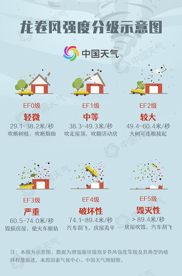 龙卷风生成和消失都迅速,常与雷暴、冰雹和暴雨等强对流天气系统相伴出现,破坏力极强。按藤田级数,龙卷强度分为EF0级至EF5级6个等级,EF0级别最低,EF5为最高级别。