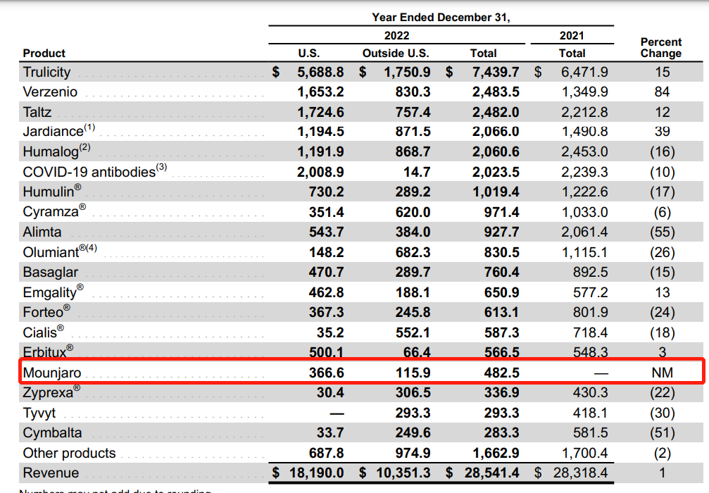 礼来2022年财报披露重要单品的销售数据