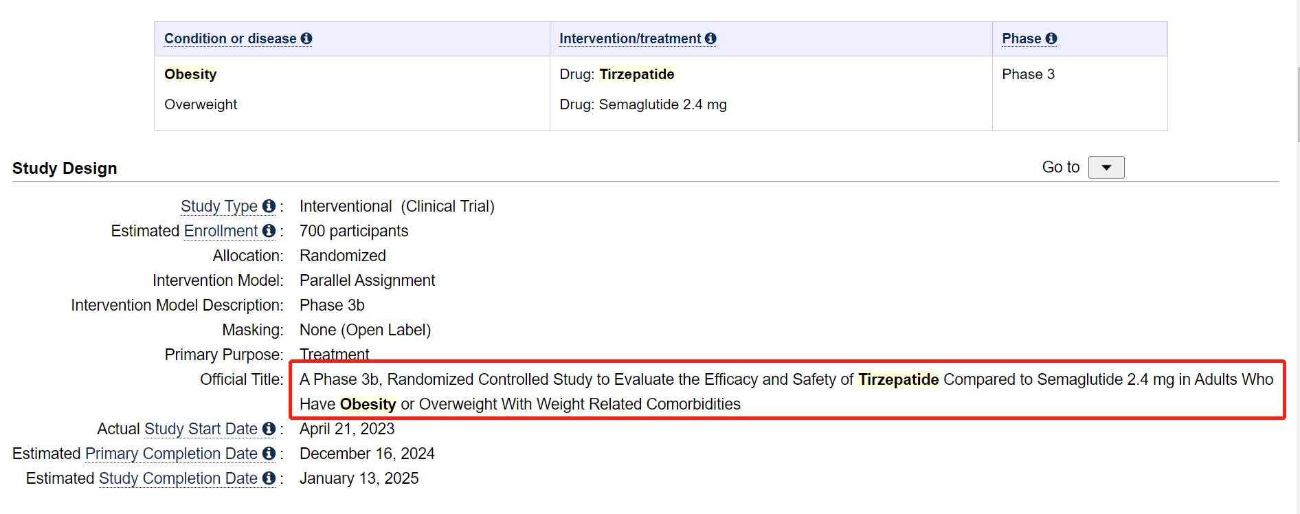 也许是对自家GLP-1产品信心十足,礼来主动发起了与诺和诺德GLP-1的头对头挑战。4月21日,礼来在美国临床试验数据库clinicaltrials.gov网站登记了一项新的3b期临床试验,评估替尔泊肽与司美格鲁肽2.4 mg在肥胖或超重伴有体重相关合并症的成人中的疗效性和安全性。