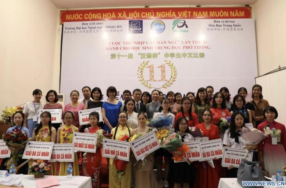 2018年8月第11届“汉语桥”世界中学生中文比赛越南北部赛区决赛赛后合影 图源:新华社