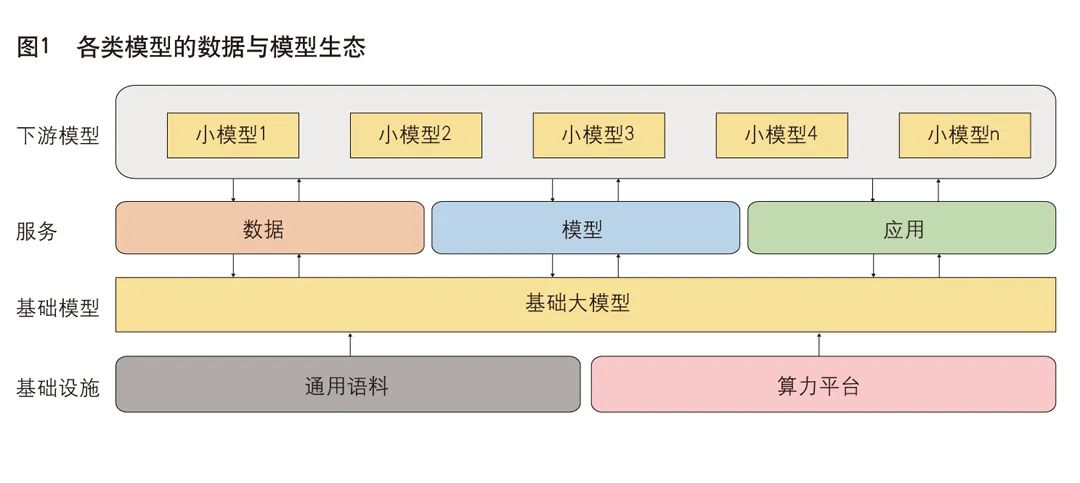 过去,在分散化的模型研发模式下,单一的人工智能应用场景下多个任务需要由多个模型共同支撑完成,每一个模型建设都要经历算法开发、数据处理、模型训练与调优过程。预训练大模型增强了人工智能的通用性、泛化性,基于大模型通过零样本或小样本精调,就可在多种任务上取得较好效果。大模型“预训练+精调”模式为人工智能研发带来了新的标准化范式,使人工智能模型可以在更统一、更简明的方式下实现规模化生产。围绕技术创新与应用落地,大模型的数据和产业生态可划分为基础设施(包括通用语料及算力平台)、基础大模型、大模型服务(包括合成数据、模型供给及应用插件)。在下游应用中,用户可以部署自己的小模型,通过大模型的各种服务来提升性能,同时也可反向给大模型提供相应的反馈服务,帮助大模型迭代进化(见图1)。