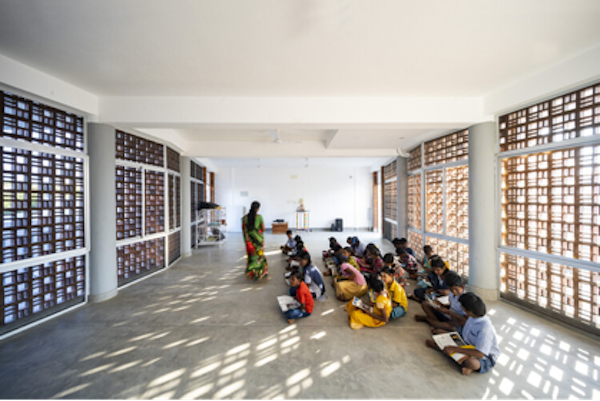 贾利并不是只存在于古建筑上的装饰,它散热降温的优势也应用在了印度现代的建筑中。2019年落成的Sharana日托中心就采用了大量的陶土贾利作为外墙,不仅简化了施工过程、增加通风透气,也让这个促进教育平等的空间保持开放,让外面的人也能看到里面的学生活动情况。