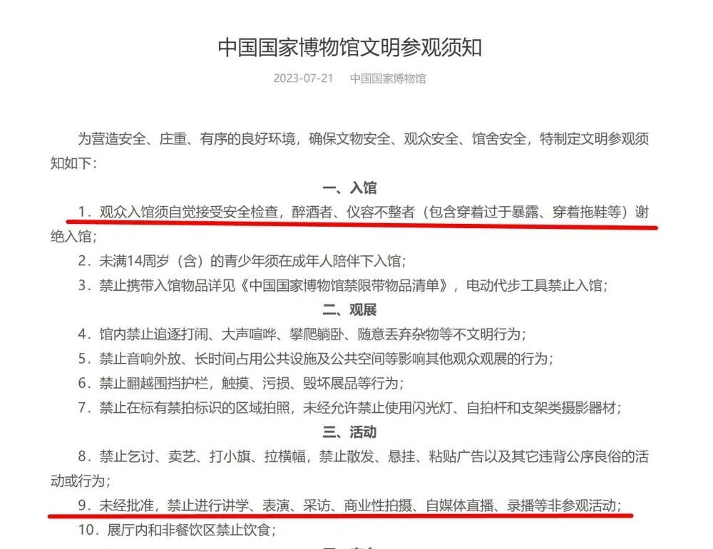 据央广网消息,7月22日,中国国家博物馆(国博)发布《文明参观须知》,其中提出:未经批准,禁止进行讲学、表演、采访、商业性拍摄、自媒体直播、录播等非参观活动;仪容不整者(包含穿着过于暴露、穿着拖鞋等)谢绝入馆。