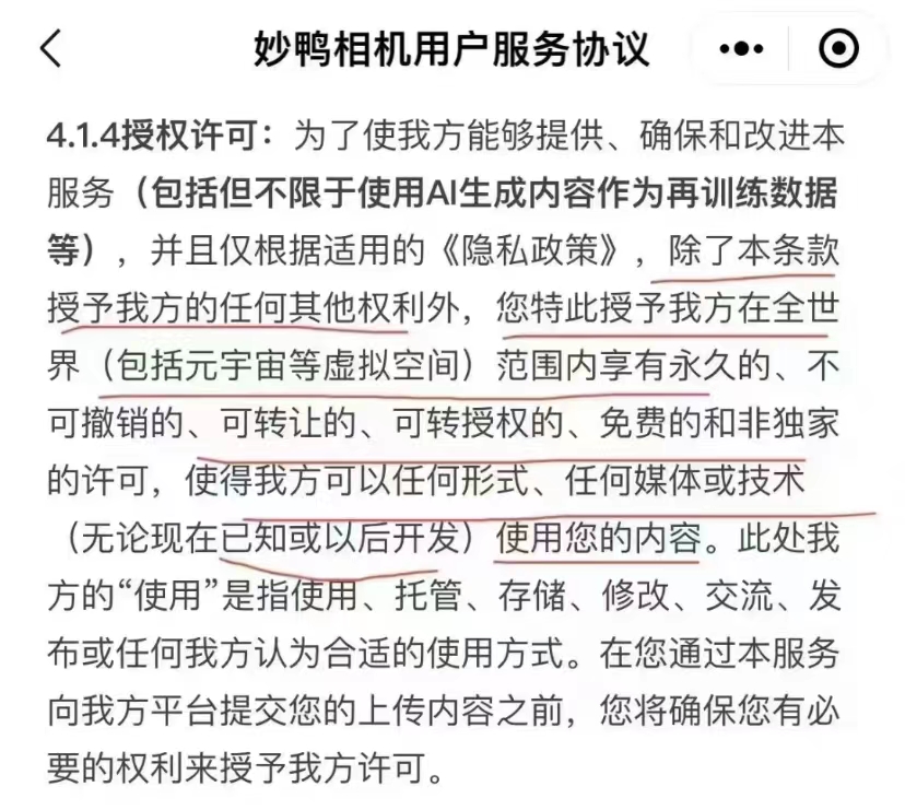 与此同时,“妙鸭相机”早前的《用户服务协议》(以下简称《协议》)又被网友翻出。《协议》称,“授予我方在全世界(包括元宇宙等虚拟空间)范围内享有永久的、不可撤销的、可转让的、可转授权的、免费的和非独家的许可,使得我方可以任何形式、任何媒体或技术使用您的内容”。