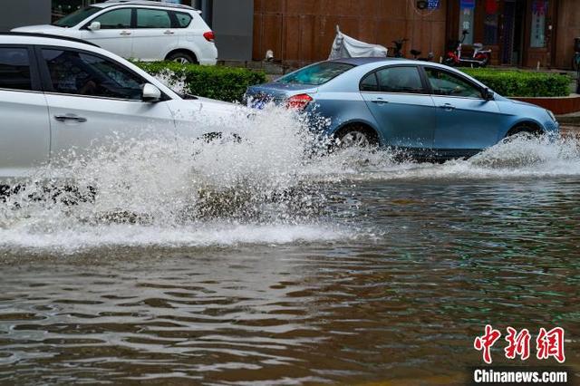 哈尔滨街头,车辆在积水中行驶。 中新网 图