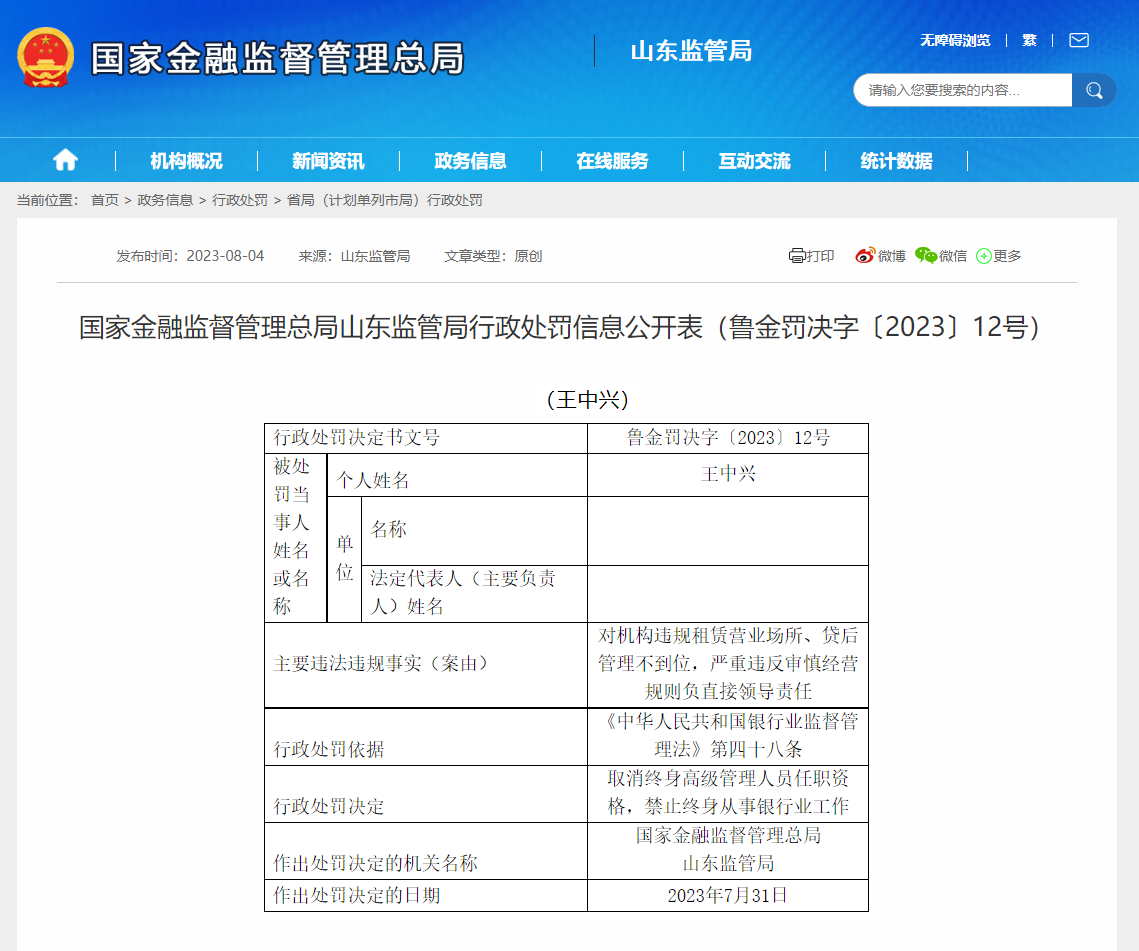 8月4日,国家金融监督管理总局山东监管局发布的行政处罚信息公开表显示,中信银行股份有限公司(以下简称“中信银行”)济宁分行因违规租赁营业场所、贷后管理不到位、严重违反审慎经营规则等,被处以罚款200万元。王中兴对上述违法违规行为负直接领导责任,被取消终身高级管理人员任职资格,并禁止终身从事银行业工作。