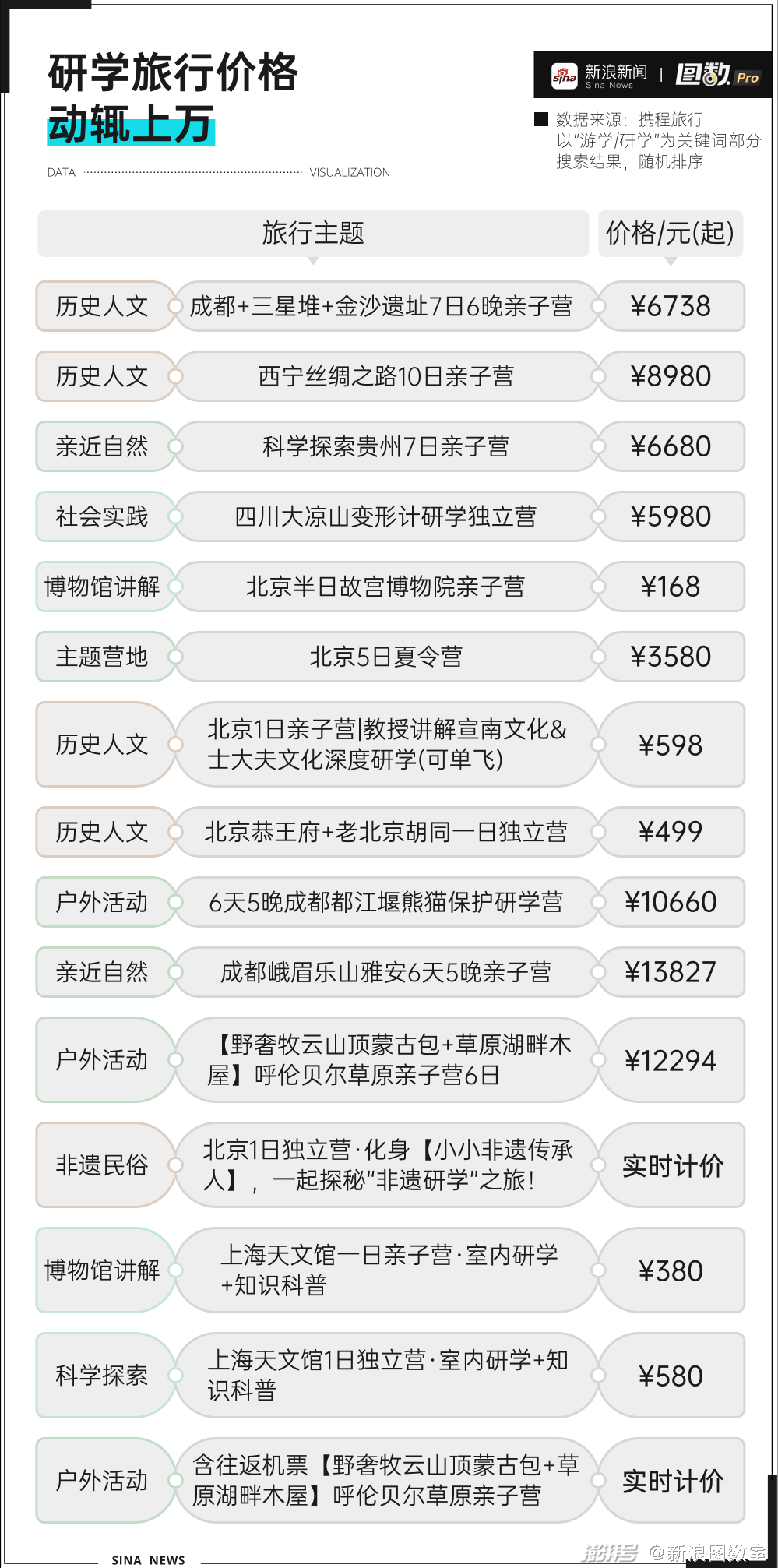 今年研学有多热呢?以研学旅游为关键词,搜索携程发现共有975个产品,其中价格最高为26800元起,价格最低为92元起,产品内容横跨国内外各个地点。人均6000的研学旅行丝毫没有阻止家长们“火辣辣”的热情。