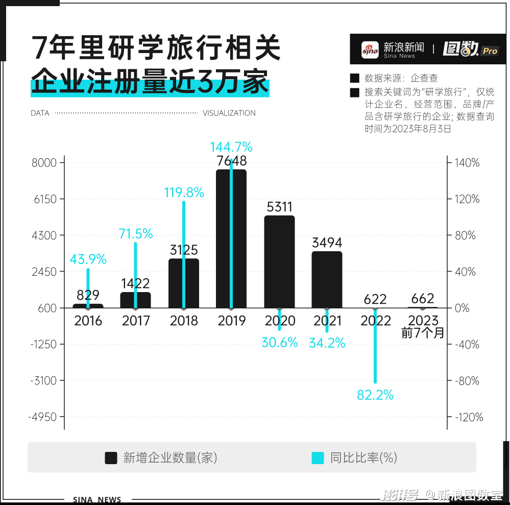 企查查数据显示,2020年以前,我国研学旅行相关企业数量逐渐增长,仅2019年,就有7648家相关企业注册成立。尽管受疫情影响,2020年到2022年,新成立的研学旅行相关企业增速下滑,但总数也一直呈增长趋势。而到了今年,前7个月新成立的研学旅行相关企业数量就已经超过了2022年全年。