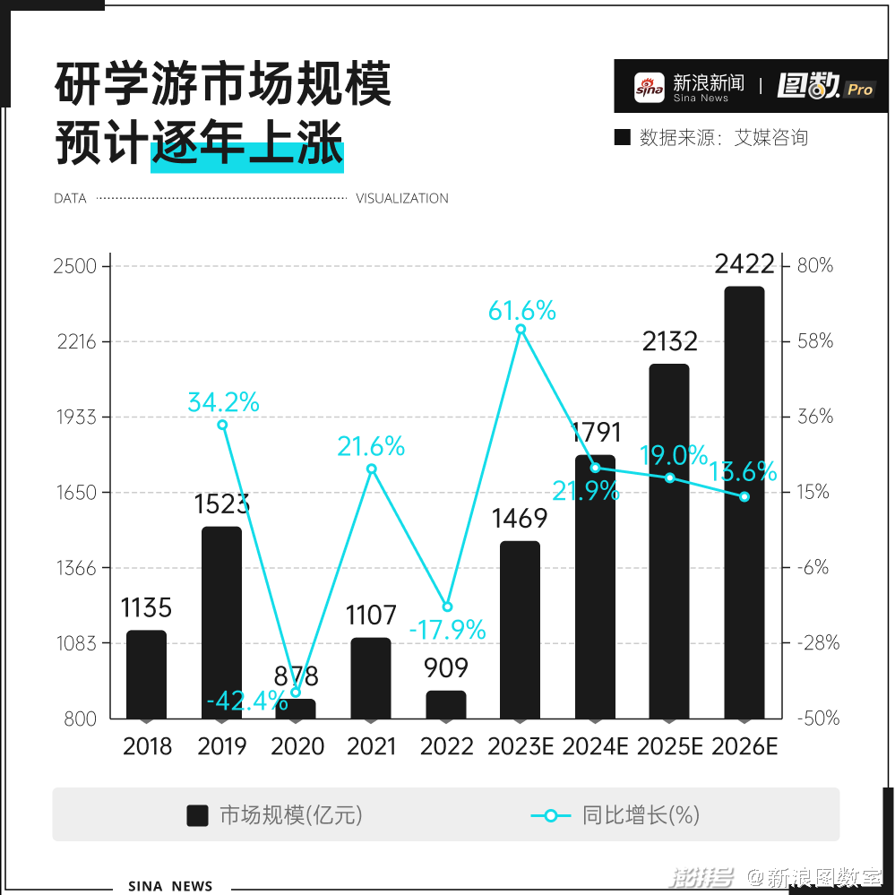 研究机构预测,预计2023年中国研学游市场规模达到1469亿元,同比增长61.6%,预计2026年市场规模将达到2422亿元。