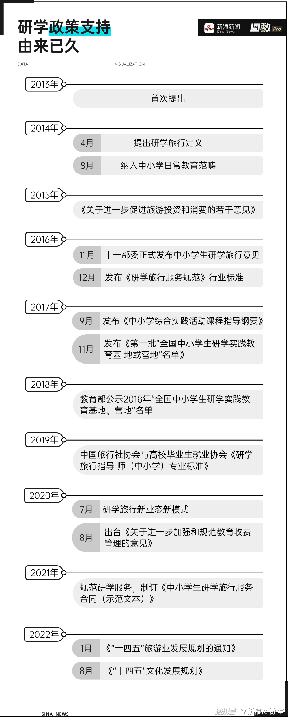 早在2013年,国务院办公厅关于印发《国民旅游休闲纲要(2013—2020年)》中就提出“逐步推行中小学生研学旅行”的设想,次年4月提出了研学旅行的定义,8月即纳入中小学日常教育范畴。到2016年,十一部委正式发布中小学生研学旅行意见,指出“中小学生研学旅行是学校教育和校外教育衔接的创新形式,是教育教学的重要内容,是综合实践育人的有效途径。”