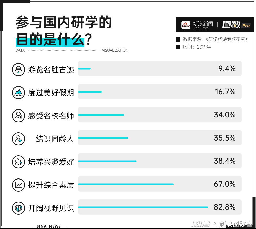 国家层面对研学的重视,推动需求端的不断增长。另一方面,素质教育的背景之下,研学旅行这种“寓教于乐”的方式也正好戳中家长们的心理。以2019年的研究数据就可以看出,家长们为孩子报名研学的目的主要是为了开阔视野见识、提升综合素质。