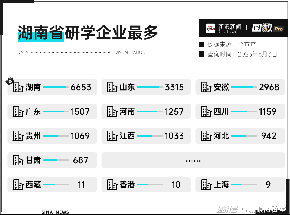 如果把视角扩大到到省,会发现研学企业主要集中分布在华东、华中地区。其中,数量最多的省份是湖南省,为6653家,最少的是上海,仅有9家,而北京也只有41家。