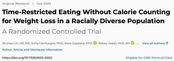 [1]Lin S, Cienfuegos S, Ezpeleta M, Gabel K, Pavlou V, Mulas A, Chakos K, McStay M, Wu J, Tussing-Humphreys L, Alexandria SJ, Sanchez J, Unterman T, Varady KA. Time-Restricted Eating Without Calorie Counting for Weight Loss in a Racially Diverse Population : A Randomized Controlled Trial. Ann Intern Med. 2023 Jul;176(7):885-895. doi: 10.7326/M23-0052. Epub 2023 Jun 27. PMID: 37364268.