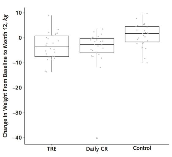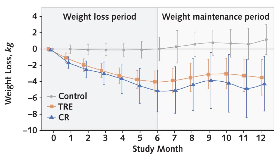 经历了1年的随访之后,研究者发现,TRE和CR在减肥效果上“半斤八两”!