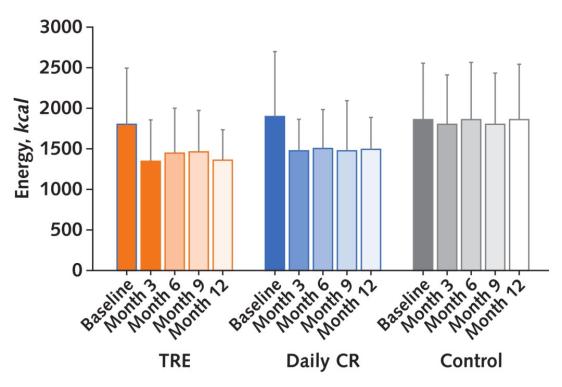 三组间的体重变化趋势大众的正常认知中,限时进食就是不计算卡路里,“想吃多少吃多少”。但人们往往高估了自己在8小时内能吃的量,实际情况并非如此。本研究中,TRE组的每日能量摄入平均减少了425kcal!甚至超过了CR组每日减少的405kcal。
