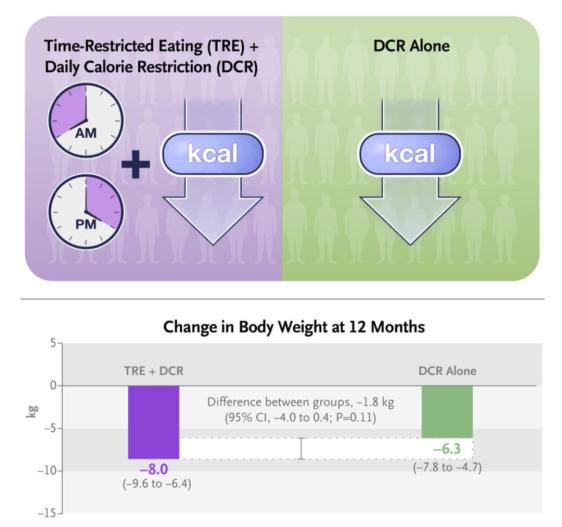 [2]Liu D, Huang Y, Huang C, Yang S, Wei X, Zhang P, Guo D, Lin J, Xu B, Li C, He H, He J, Liu S, Shi L, Xue Y, Zhang H. Calorie Restriction with or without Time-Restricted Eating in Weight Loss. N Engl J Med. 2022 Apr 21;386(16):1495-1504. doi: 10.1056/NEJMoa2114833. PMID: 35443107.