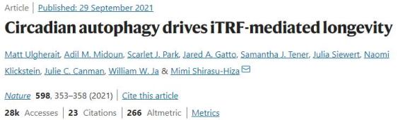 [3]Ulgherait M, Midoun AM, Park SJ, Gatto JA, Tener SJ, Siewert J, Klickstein N, Canman JC, Ja WW, Shirasu-Hiza M. Circadian autophagy drives iTRF-mediated longevity. Nature. 2021 Oct;598(7880):353-358. doi: 10.1038/s41586-021-03934-0. Epub 2021 Sep 29. PMID: 34588695; PMCID: PMC9395244.