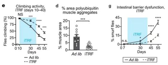 不仅如此,iTRF还改善了果蝇的衰老症状。不仅肌肉及神经元功能保持良好,爬行能力的下降幅度更小,与年龄相关的蛋白质聚集还更少,肠道微生物的丰度以及屏障完整性更好。换句话说,果蝇不仅延长了寿命,还更多地延长了健康寿命!