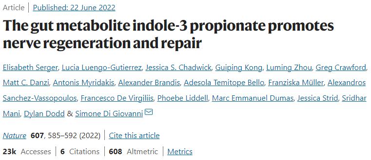 [4]Serger E, Luengo-Gutierrez L, Chadwick JS, Kong G, Zhou L, Crawford G, Danzi MC, Myridakis A, Brandis A, Bello AT, Müller F, Sanchez-Vassopoulos A, De Virgiliis F, Liddell P, Dumas ME, Strid J, Mani S, Dodd D, Di Giovanni S. The gut metabolite indole-3 propionate promotes nerve regeneration and repair. Nature. 2022 Jul;607(7919):585-592. doi: 10.1038/s41586-022-04884-x. Epub 2022 Jun 22. PMID: 35732737