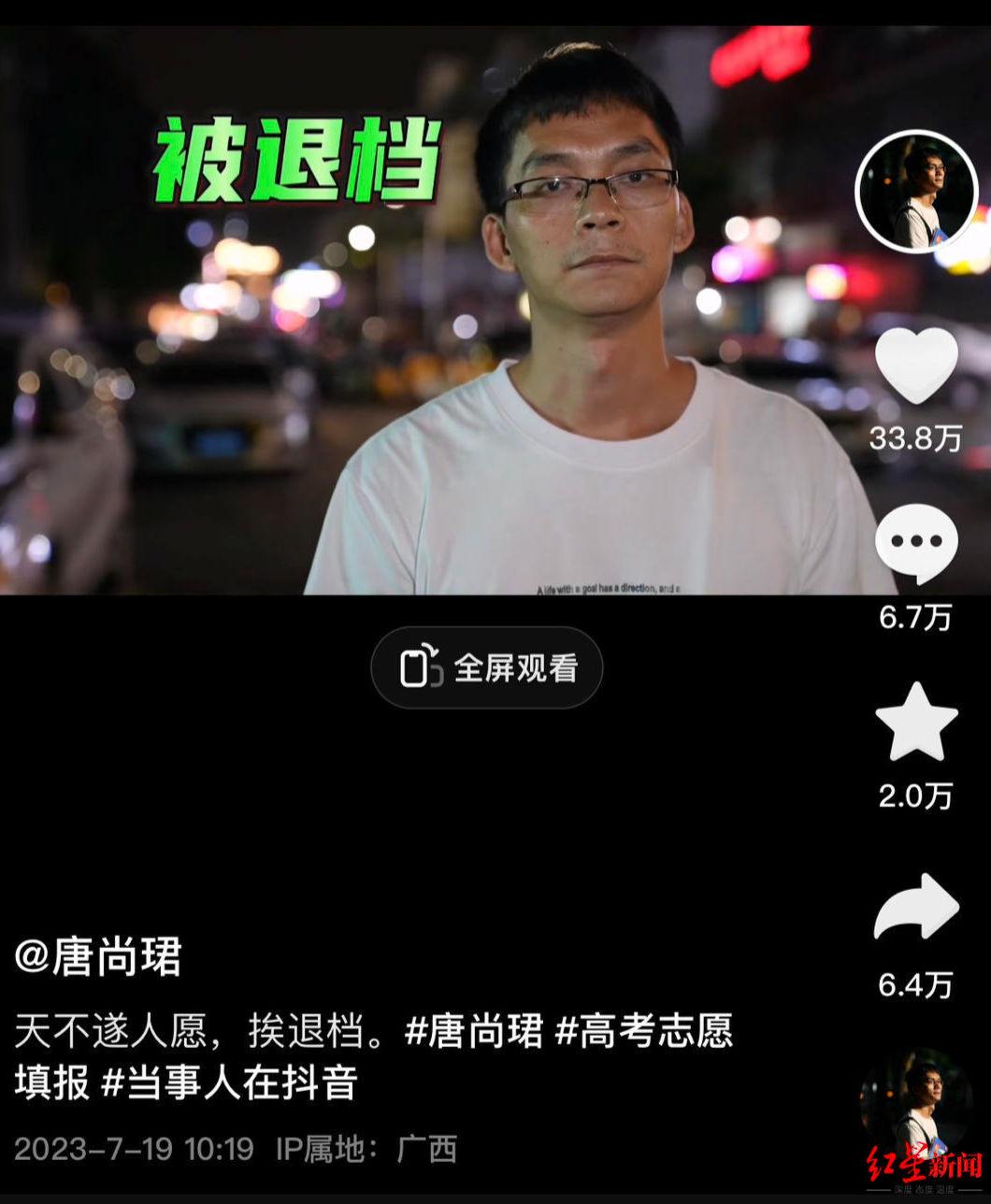 唐尚珺今年高考成绩总分594分,超过广西理工类一本线119分。此前,他除了2009年和2020年未填报志愿,其他参加高考的年份都成功被录取。他此前公布了今年的4个高考志愿,分别是北京师范大学珠海校区、华中师范大学、华南师范大学及浙江大学农业与生物技术学院。7月18日,唐尚珺得知自己被填报的华中师范大学退档,原因是“专业已录满”。更重要的是,他在报志愿时没有选择“服从专业调剂”。那一天广西有台风过境,“他的心情跟天气一样潮湿动荡”,唐尚珺好友何汉立说。次日唐尚珺发布视频提到自己将参加补录。