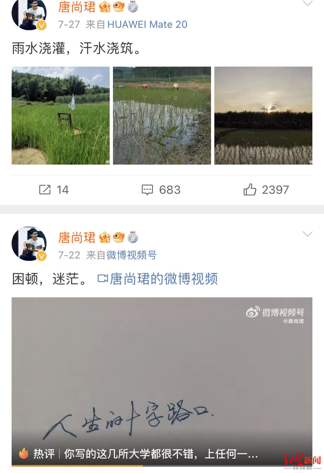 今年高考后,唐尚珺在个人社交平台上更新比较频繁,发布的视频画面画质清晰,剪辑专业,他还开通了几次直播,在某平台的粉丝数量也猛涨到了40万。今年7月,有媒体询问是否有商业团队在专门运营唐尚珺的短视频账号?唐尚珺否定了这个说法,他提到这个账号是他和在电视台工作、有专业设备的同学何汉立一起弄的,所以才像是有团队运作。唐尚珺告诉红星新闻记者,是有一些公司想要和他合作运营自媒体,但是他个人没心思弄,都婉拒了也就没有后续。关注他的多是关心他以后发展的网友。他做自媒体,在上面发布个人动态、分享个人经历。