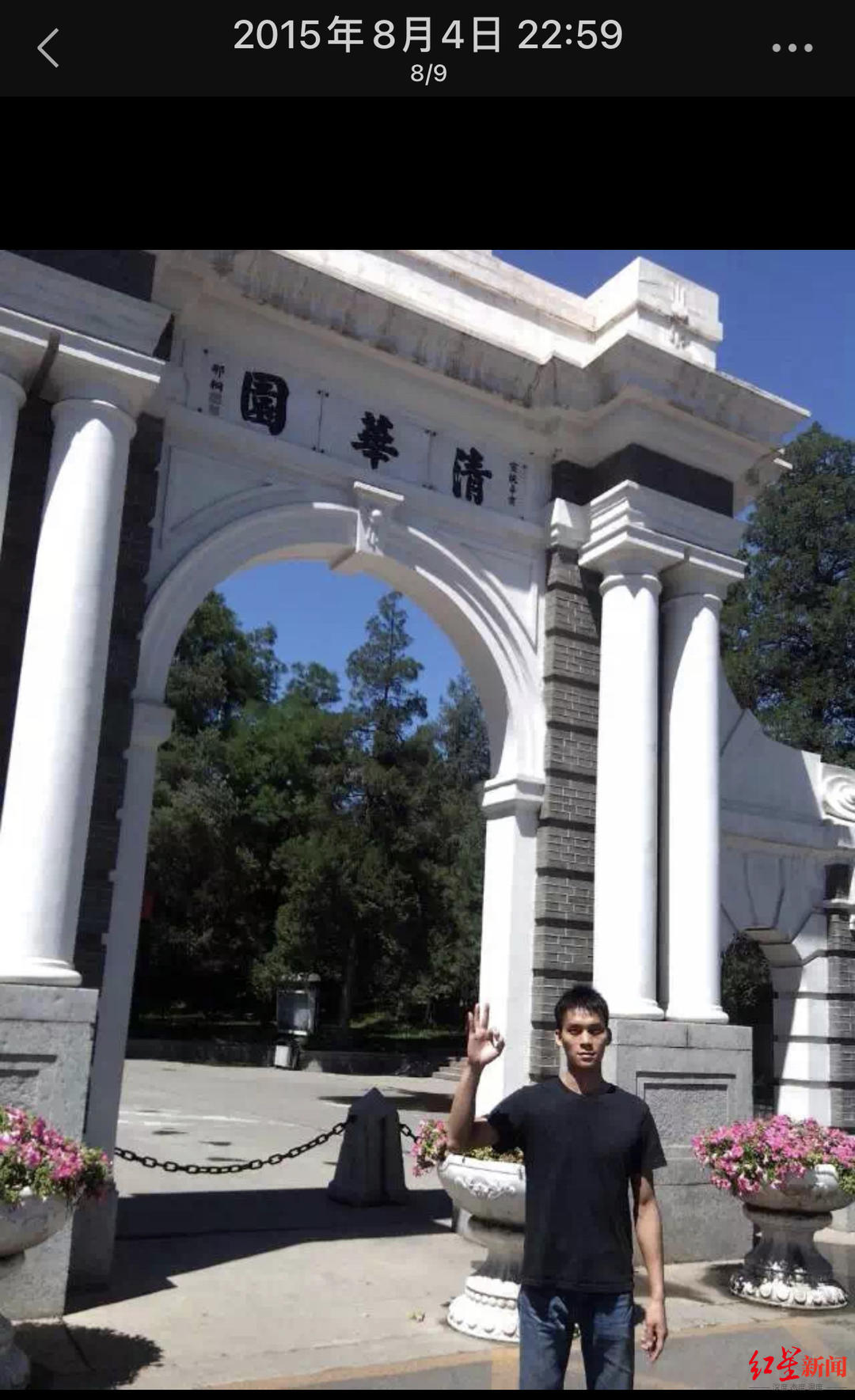 唐尚珺在朋友圈发布自己在清华门口的照片