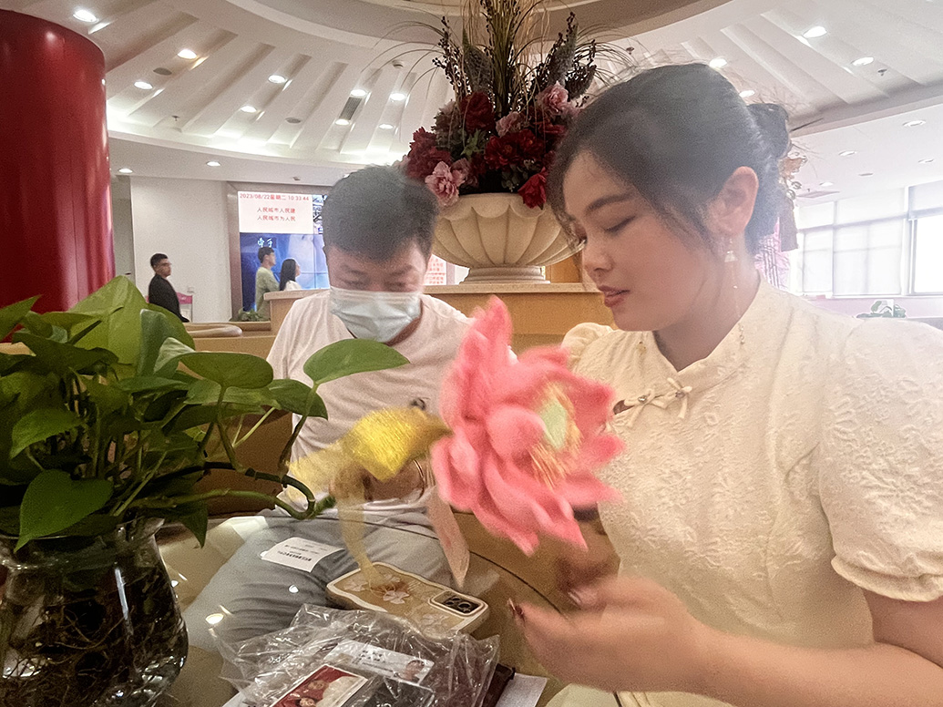 8月22日,徐汇婚登中心,新人在共编同心结。 徐汇婚登中心 供图