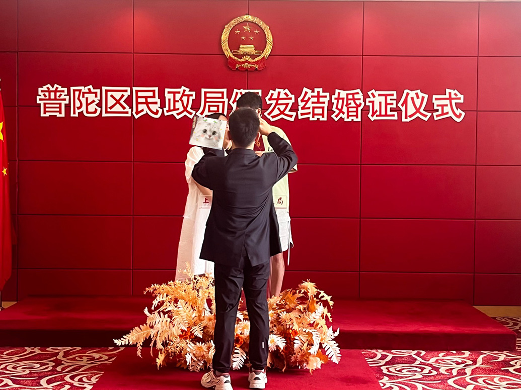8月22日,新人在普陀婚登中心颁证厅拍照。
